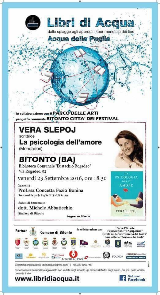 Venerdì 23 Settembre 2016 BITONTO - BARI - BARI La Psicologia dell'Amore Vera Slepoj Villa De grecis Bari La Psicologia dell'Amore Vera Slepoj Villa De grecis Bari